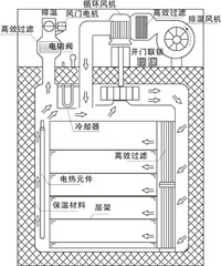 工作原理:將裝滿物料的烘盤、瓶子或小車放入箱內(nèi),啟動PLC可編程序控制系統(tǒng),內(nèi)循環(huán)風(fēng)機(jī)工作、加熱、蝶閥同時開啟、干燥箱迅速升溫。在內(nèi)循環(huán)風(fēng)機(jī)作用下,于熱空氣通過耐高溫高效過濾器進(jìn)入箱體,在微調(diào)節(jié)板作用下形成一個均勻分布空氣向箱體內(nèi)傳遞,干燥空氣吸收瓶子(物料、物品)表面的水分,進(jìn)入加熱通道蒸發(fā)排出、干空氣在風(fēng)機(jī)作用下定向循環(huán)流動,水蒸汽排出。隨著水蒸汽逐漸減少、同時間隙性補充新鮮過濾空氣,箱體內(nèi)呈微正壓狀態(tài),恒溫結(jié)束,過程控制完畢。開啟送風(fēng)或(進(jìn)水)強制冷卻,自動蝶閥進(jìn)入關(guān)閉狀態(tài),聲光提示開門出瓶。